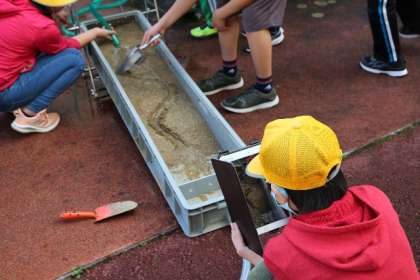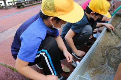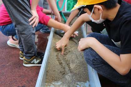 5年生の理科で流れる水の働きについての実験をしました。あらかじめ、砂や小石を容器に敷き詰め、そこに溝を作り、水を流しました。曲がり角での砂や小石の様子、流れてきた砂などの様子について、興味をもって観察していました。