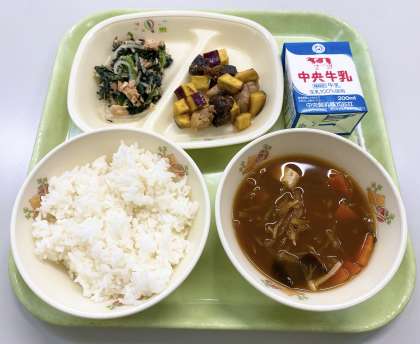 【ごはん、牛乳、レバーとさつまいもの甘辛煮、のり酢あえ、切干し大根の味噌汁】でした。