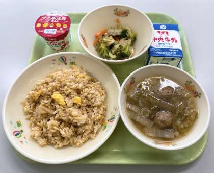 【キムチチャーハン、牛乳、中華サラダ、肉団子スープ、ヨーグルト】でした。