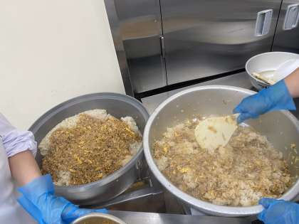 キムチチャーハンは、お米を炊くときに調味料やごま油と一緒に炊きます。そして、別で炒めておいたチャーハンの具材を、そこへ混ぜ合わせて作っています。完成したときに、味付けが薄かったり濃すぎたりしないようにするためには、細かい調味料の計算が必要になってきます。今日もみなさんしっかりと食べていてよかったです。