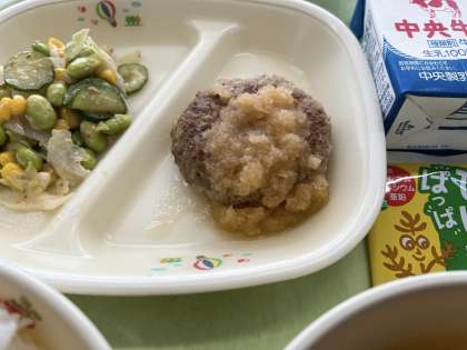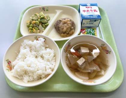 【ごはん、牛乳、ハンバーグ和風おろしソース、えだまめサラダ、八杯汁、ひじきふりかけ】でした。