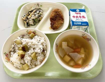 【さつまいもごはん、牛乳、かつおフライ、骨太サラダ、五目汁】でした。