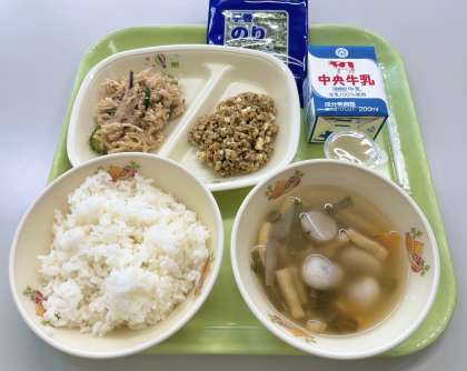 【ごはん、牛乳、チーズ納豆、切干大根と椎茸のサラダ、いものこ汁、なしゼリー、手巻きのり】でした。