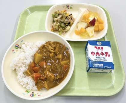 【チキンカレー、牛乳、りっちゃんの元気サラダ、りんごポンチ】でした。