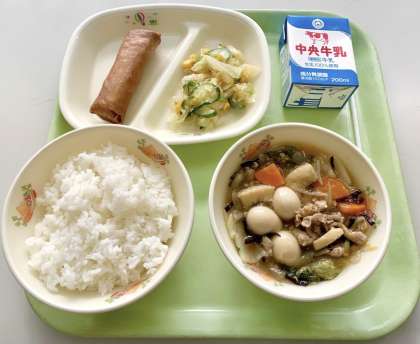 【ごはん、牛乳、青しそ入り春巻き、中華風酢の物、八宝菜】でした。