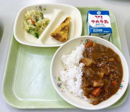 12月7日(火)の給食は、 【ハヤシライス、牛乳、スパニッシュオムレツ、イタリアンサラダ】でした。