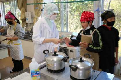 緊急事態宣言や厳重警戒措置のために行えなかった調理実習、12月9日に感染症対策をとりながら実施しました。久しぶりの実習なので、子どもたちも楽しそうでした。てきぱきと行う様子も見られました。
