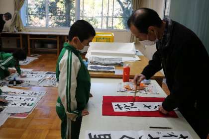 12月15日、書道連盟から講師の先生が見え、書き初めの指導をしてくださいました。手本を参考に書きますが、細かい部分や注意する部分について、個々に見ていただいています。教わったことを意識して、一生懸命、練習に取り組む様子が見られました。