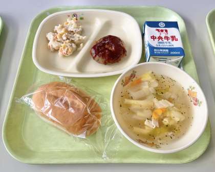 【米粉パン、牛乳、ハンバーグ、コーン入りポテトサラダ、マカロニスープ】でした。