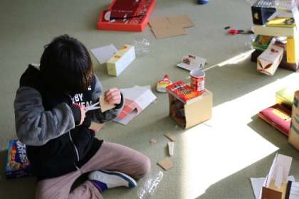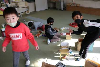 12月16日、2年生の図工は「ともだちハウス」です。空き箱などを使って、想像を膨らませ、思い思いの家を作ります。容器に合わせてお風呂を作る子もいました。互いのものを見合って、意見交換もしていました。とても楽しそうでした。