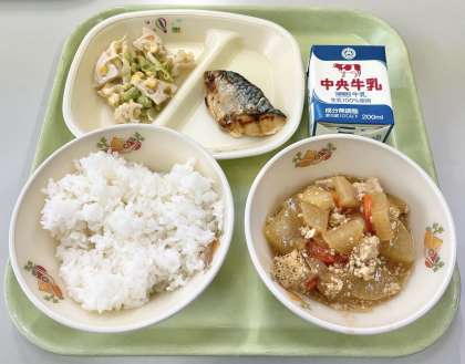 【ごはん、牛乳、さばの塩焼き、れんこんサラダ、大根のそぼろ煮】でした。
