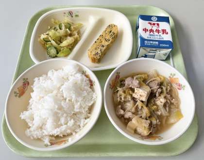今日のすき焼き風煮に使われている白菜は、猿投地区で収穫された黄心(きごころ)という品種の白菜です。みずみずしくてほんのり甘い白菜を、ふんだんに使ったすき焼き風煮は、どの学年からも好評でした。しっかりと食べて、寒い冬を元気に乗り切りましょう。
