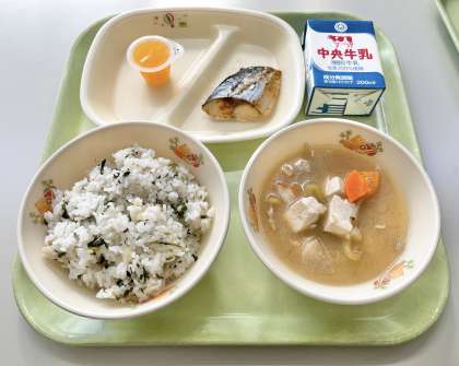 【七草ごはん、牛乳、さばの塩焼き、豚汁、プチみかんゼリー】でした。