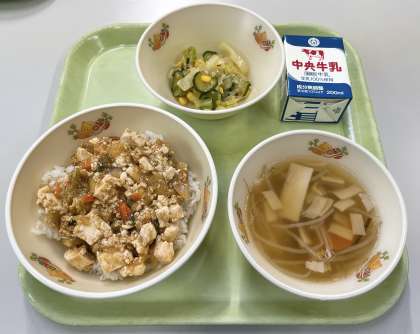 【麻婆豆腐丼、牛乳、中華風酢の物、ワンタンスープ】でした。