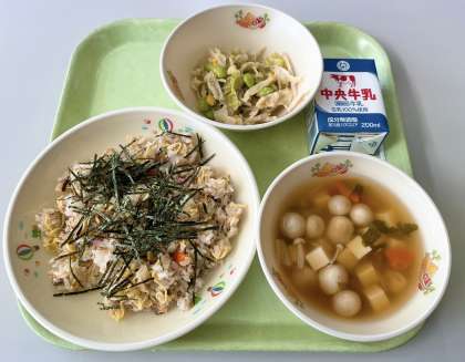【丹後のばら寿司、牛乳、ごぼうと枝豆のサラダ、ふ玉汁】でした。