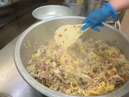 京都府の北部に位置する丹後地方の郷土料理「丹後のばら寿司」を作りました。普通のちらし寿司と違い、サバのほぐし身を甘辛く煮つけたものが具材に入っています。丹後地方では、サバの漁獲量が多いことから、古くからこの料理が親しまれてきました。初めての献立でしたが、みんなしっかりと食べることができて良かったです。