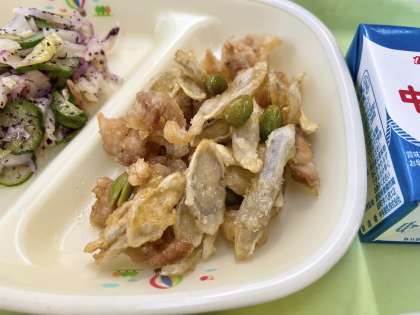 チキンチキンごぼうは、山口県の郷土料理です。鶏肉とごぼうに片栗粉をまぶして、それぞれ油でカリッと揚げます。最後に甘辛いタレを混ぜ合わせて完成です。もともとは、山口県の学校給食で人気のメニューだったものが、家庭へと広まり、山口県民のソウルフードとなったようです。今日もみんなしっかりと完食することができました!