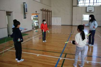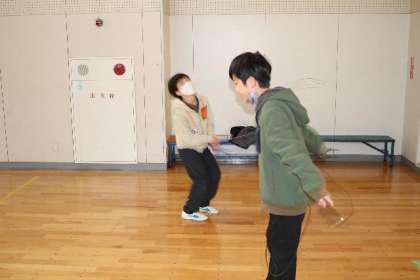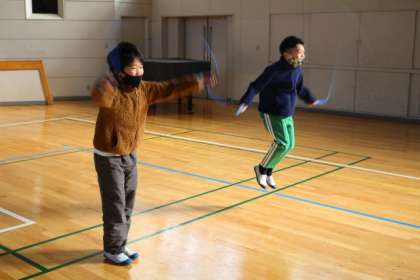 中には、後ろ二重跳び、はやぶさ(二重跳びの間に腕の交差をおりまぜて跳ぶ技)、つばめ(交差の二重跳び)に挑戦する児童もいます。