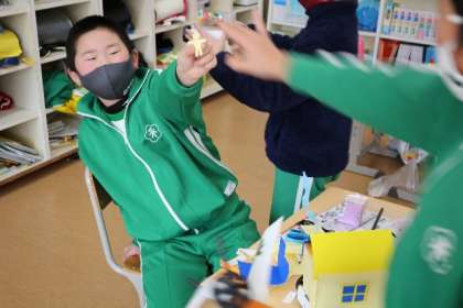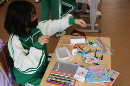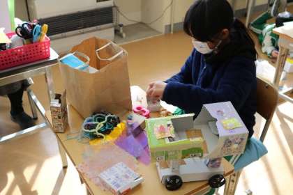 4年生の図工は、「ゴーゴードリームカー」です。空き箱や折り紙など身近な材料を使って、思い思いの車を作っています。紙を人型に切って乗せたり、毛糸できれいに飾り付けたりしていました。
