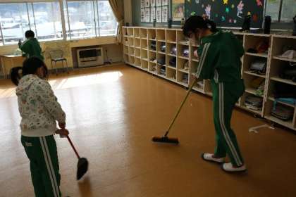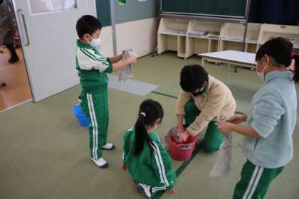 寒い中ですが、子どもたちは清掃を黙々と行っています。高学年が低学年に丁寧に教える様子も見られます。