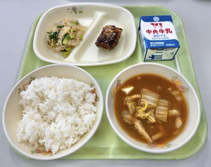 【ごはん、牛乳、かつおのおかか煮、大根のピリ辛あえ、白菜のみそ汁】でした。