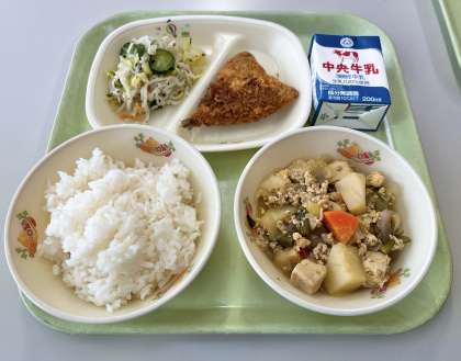 【ごはん、牛乳、あじフライ、切干し大根の青菜あえ、高野豆腐の卵とじ】でした。
