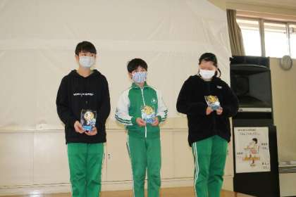 いなほ金賞を授与した3名に対して盾が授与されました。盾を他の児童にも披露すると、歓声が聞こえてきました。授与された3名はうれしそうな表情を見せていました。