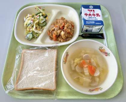 【スライスパン、牛乳、スラッピージョー、カニカマサラダ、コンソメスープ、コーヒー牛乳のもと】でした。