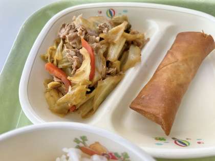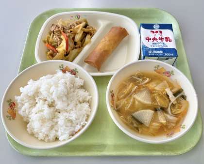 【ごはん、牛乳、愛知の野菜入り春巻き、ホイコーロー、キムチスープ】でした。