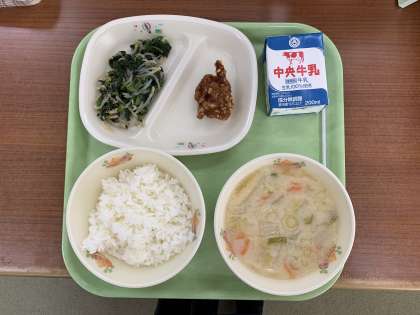 ごはん 豆乳入りみそ汁 鶏肉のから揚げ のり酢あえ