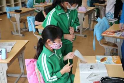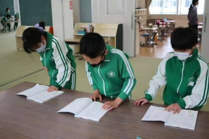 どの教室をのぞいても、元気な子どもたちの様子が見られます。算数の学習では、できたところを互いに確認する様子、国語の音読では、グループになって読み方を工夫し合う様子などが見られました。