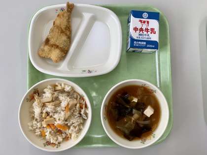 たけのこごはん にぎすフライ じゃがいものみそ汁