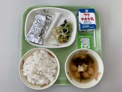 ごはん 若竹汁 さばの銀紙焼き くるみあえ 豊田市産抹茶ふりかけ