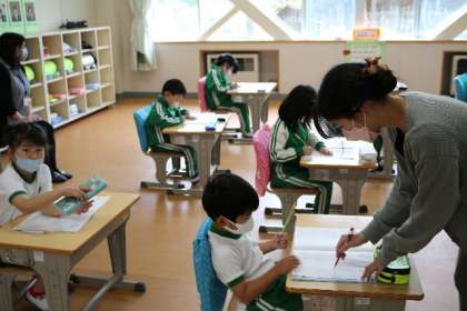 園小連絡会があり、稲武こども園の先生が来校されました。1年生の国語(平仮名の学習)で、元気に発言する様子、丁寧にプリントへ記入する様子などを参観されました。