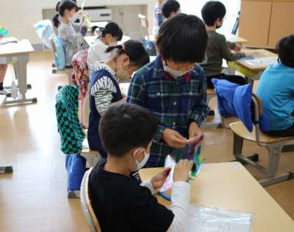 教室に入ると子どもたちの様々な姿を目にします。図工の時間には、作品作りで苦労している友達に手を差し伸べる子がいました。