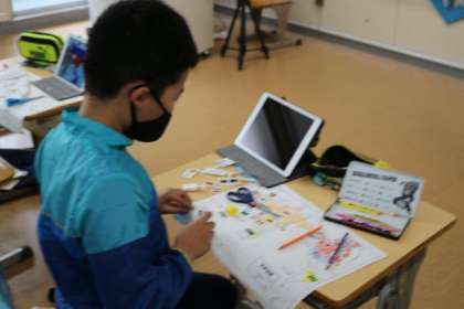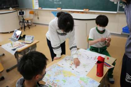 社会の時間では世界地図に国名や国旗を記したり貼ったりする時、進んでアドバイスをする子がいました。また、タブレットを活用して国の様子を積極的に調べる子もいました。