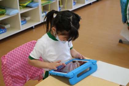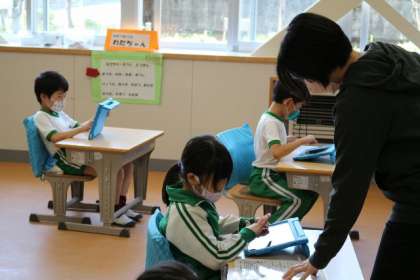 5月18日、1年生はタブレットの使い方を学んでいます。担任の説明を聞き、操作をしています。画面が変わったり、思うように扱えたりすると喜びの声があがっていました。