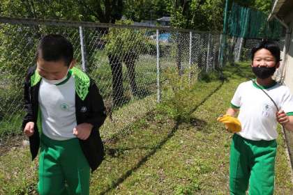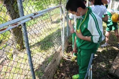 昼放課、5年生の児童が職員室にやってきました。話を聞くと、体育倉庫の裏の土手に蛇が出たとのこと。一緒に行き、探してみるとフェンスの向こうに蛇を見つけました。結局、逃げてしまいましたが、中には「捕まえたかった」という声もあがっていました。