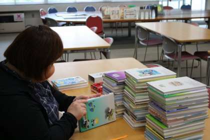 図書館ボランティアの方が来校され、本の背表紙に貼ってあるラベルの修正を行ってくださいました。子どもたちが本を選ぶときに、見やすくなりました。