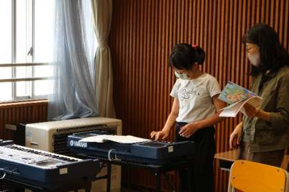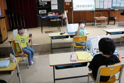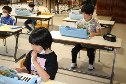 中学年は鍵盤ハーモニカに取り組んでいます。楽譜を見て演奏したり、その演奏に合わせて歌ったりしています。うまく演奏できると、うれしそうな表情を見せていました。