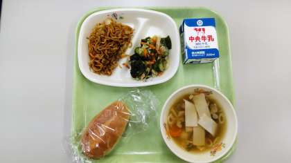 給食センターでは美味しい焼きそばにするために、麺を一度オーブンで焼いています。焦げ目がつくくらいしっかり焼くことで、野菜の水分を吸っても美味しく仕上がります。
