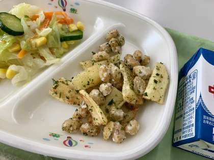 青のりポテトビーンズは揚げた大豆とじゃがいもを青のりと塩で味付けしたシンプルなおかずです。大豆は子どもたちからの人気がない食材ですが、この献立なら喜んで食べてくれます。大豆は栄養がたっぷりなのでしっかり食べてほしいです。