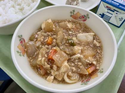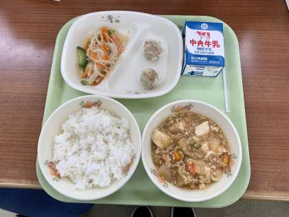 麻婆豆腐は日本で人気の中華料理です。給食では子ども園用はマイルドに、小中学校用には少し一味唐辛子を入れてピリ辛に仕上げています。子どもたちからも人気の献立です。
