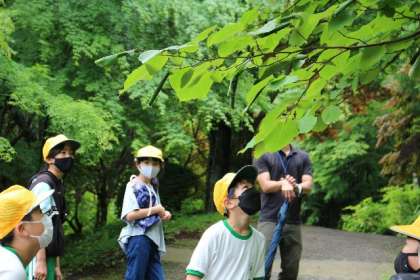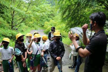 5年生が大井平公園に出かけ、森林学習をしました。豊田市森林課の方を講師に招き、草木の名前や様子を教えていただいたり、昆虫やモリアオガエルの卵を観察したりしました。興味津々な様子でした。