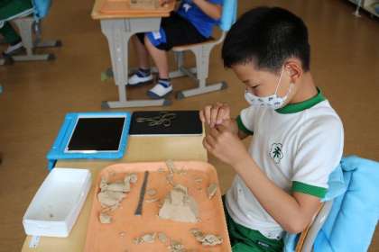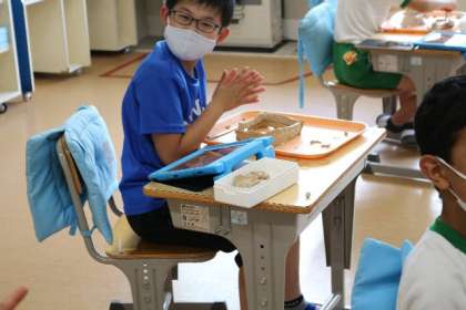 3年生は粘土を使って、思い思いのお城を作っています。アイデアがわくように、タブレットでお城の画像を見て参考にしています。どんなお城ができるか、楽しみです。