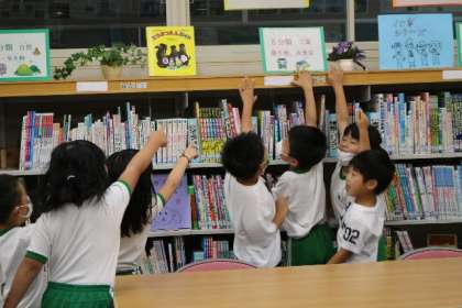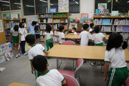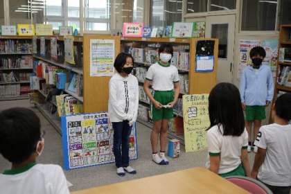 ブックランド委員が、1年生を対象に図書室に関するクイズを出しました。どの場所にどんな本が置いてあるのか、どのように本を探すかなど自分たちでクイズを作り、出題していました。答える1年生も楽しそうでした。