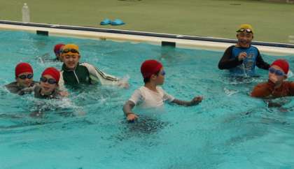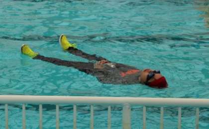 5,6年生を対象に、水難学会の方を招いて着衣泳の講習会を行いました。着衣状態の「浮いて救助を待つ」ことの学習です。初めて体験する児童も多く、動きにくさを感じていたようです。ペットボトルを使った背泳ぎを上手に行えていました。