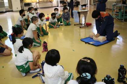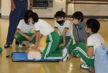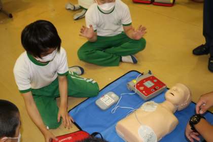 高学年を対象に救命講習を行いました。消防署の方やボランティアの方をお招きし、心臓マッサージやAEDの使い方を教えていただきました。実際に人形を使ったマッサージでは、テンポよく、適切な強さで圧迫できた児童が多く見受けられました。AEDの扱いも、指示に従って行えました。