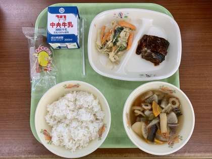 ごはん さばのみそ煮 野菜のねりごまあえ のっぺい汁 月見団子