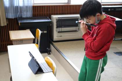 タブレットで講師の方が演奏している笛の映像を見ながら、指使いをまねて練習しました。